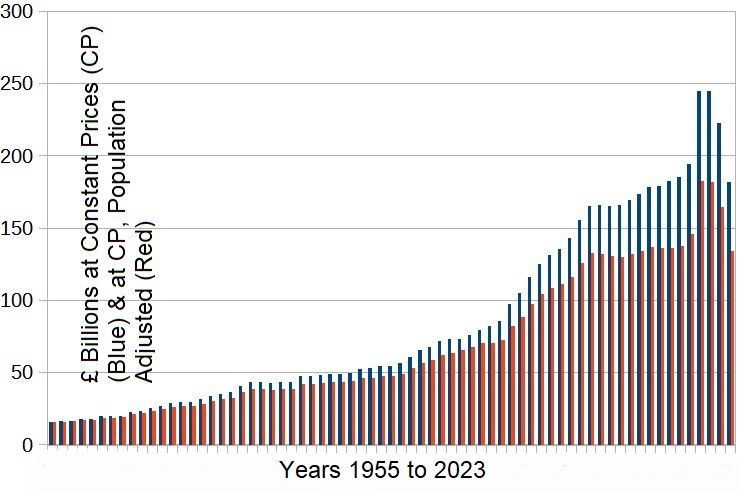 Again so far so good. But there is one very salient factor that has been ignored – population. In 1950 the United Kingdom was said to be more or less permanent home to neatly 50 million of us. Today it is sixty-eight million at least. Some even have it at nearer seventy-five but whatever the true situation resource is being expended on more people and it makes a difference, one which needs, at least to be reflected. So let’s do it.